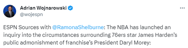 哈登大骂莫雷是骗子的言论引起轩然大波,目前NBA联盟已经正式介入调查此事,联盟办公室正在了解哈登暗示自己可能不出战2023-24赛季,是否存在违反劳资协议的行为;或者他暗示的内容是否代表他和76人早有过合同的讨论,其中是否存在规避工资帽的行为。