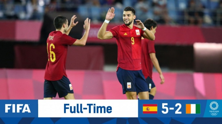JRS直播网7月31日讯 北京时间7月31日下午16:00,东京奥运会男足第一场1/4决赛,西班牙对阵科特迪瓦。上半场,明格萨伤退,拜利角球破僵,奥尔莫扳平,乌奈-西蒙神扑,奥亚萨瓦尔越位进球。半场结束,西班牙暂1-1科特迪瓦。下半场,阿森西奥中框,格拉德尔小角度破门,拉法-米尔绝平。常规时间90分钟结束,西班牙2-2科特迪瓦进加时。加时赛上半场,拜利禁区内手球奥亚萨瓦尔点射。加时赛下半场,拉法-米尔连入两球戴帽。西班牙5-2淘汰科特迪瓦,四强战将面对日本和新西兰之间的胜者。