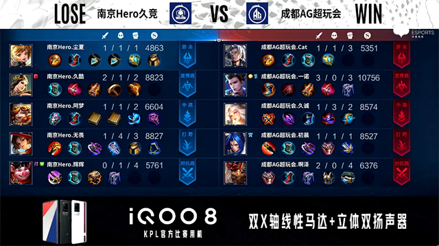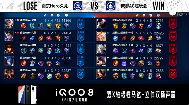 双方常规开局。1分21秒南京Hero拿下中路河道之灵。2分05秒成都AG对抗路击杀云缨拿到一血。2分27秒成都AG拿下主宰。3分37秒双方中路1换1。4分19秒南京Hero拿下暴君。6分56秒成都AG抢到主宰。7分35秒成都AG对抗路击杀云缨。7分37秒南京Hero中路击杀嫦娥。8分43秒成都AG拿下暴君。10分20秒成都AG拿下暗影主宰。10分38秒南京Hero野区击杀嫦娥。11分14秒南京Hero拿下暗影暴君。11分59秒成都AG野区击杀橘右京。12分40秒中路团战成都AG打出1换3。13分08秒成都AG团灭对手摧毁水晶拿下比赛。
