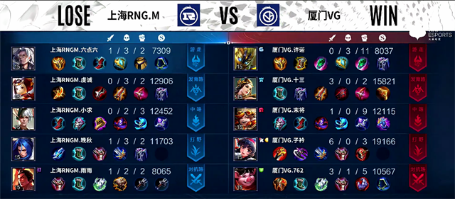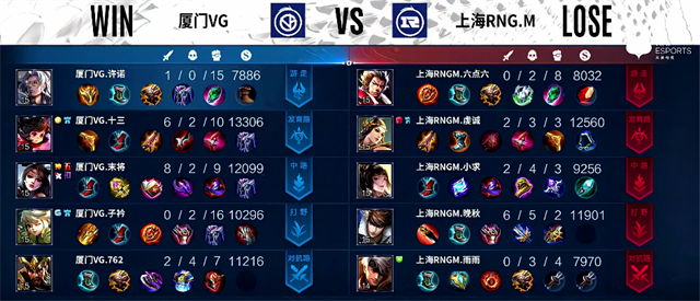 双方和平开局。2分15秒中路团战,厦门VG打出1换2,兰陵王拿下一血。3分50秒黄忠被越塔击杀。4分10秒暴君团,双方1换1,兰陵王拿下暴君。5分45秒伽罗推掉下路一塔。6分30秒阿古朵推掉中路一塔,姜子牙被击杀。7分30秒黄忠拿下主宰。8分36秒盾山被击杀。9分10秒阿古朵拿下暴君。11分10秒暴君团,双方1换1,马超拿下暴君。13分20秒中路团战,姜子牙被击杀,厦门VG中路二塔被破。14分钟阿古朵拿下主宰。14分30秒河道团战,厦门VG打出0换3,厦门VG推掉中路一塔。15分30秒兰陵王拿下暴君。17分20秒中路团战,上海RNG.M打出2换5团灭厦门VG。18分03秒上海RNG.M推掉水晶率先拿下赛点。