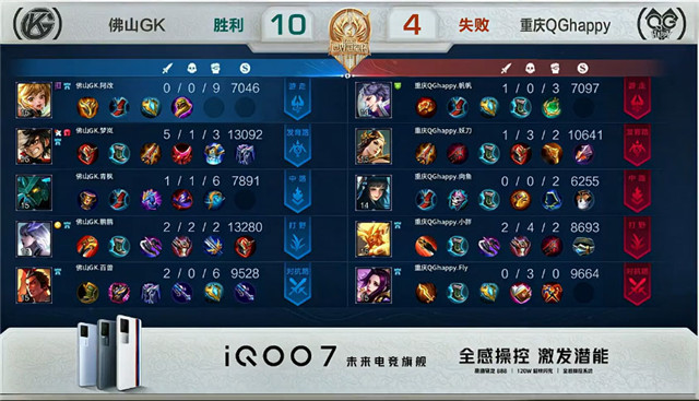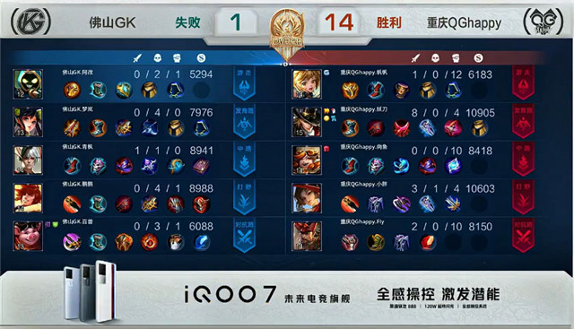 双方常规开局,1分26秒佛山GK对抗路击杀马超拿到一血。1分30秒重庆QG阿古朵野区单杀露娜。2分08秒双方对抗路1换1。2分30秒佛山GK摧毁敌方对抗路外塔。2分39秒佛山GK公孙离发育路单杀狄仁杰。3分15秒发育路团战佛山GK打出1换3。4分28秒佛山GK拿下暴君。5分34秒佛山GK拿下主宰。8分11秒佛山GK摧毁敌方中路外塔。8分45秒野区团战重庆QG打出0换3。9分06秒重庆QG野区击杀公孙离。10分23秒重庆QG中路击杀周瑜。10分41秒重庆QG拿下暗影暴君。12分31秒中路团战重庆QG打出0换3。15分24秒野区团战重庆QG击杀鬼谷子。15分57秒重庆QG拿下暗影暴君。16分49秒重庆QG野区击杀夏侯惇。16分58秒重庆QG摧毁敌方对抗路高地塔。17分19秒高地团战重庆QG打出0换2。17分34秒重庆QG摧毁敌方水晶拿下比赛。