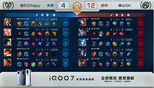 开局重庆QG边路换线。2分14秒佛山GK拿下暴君。3分02秒重庆QG对抗路打出0换2。4分41秒佛山GK镜野区单杀盘古。4分45秒佛山GK发育路击杀虞姬。4分56秒双方互换边路外塔。5分51秒对抗路佛山GK打出1换2。6分16秒重庆QG摧毁敌方中路外塔。7分46秒重庆QG抢到暴君。8分21秒佛山GK对抗路击杀芈月。8分40秒重庆QG发育路击杀镜。9分37秒重庆QG拿下主宰。10分43秒佛山GK野区击杀盘古。11分整佛山GK拿下暗影暴君。12分09秒佛山GK摧毁敌方中路外塔。12分22秒佛山GK拿下暗影主宰。13分31秒佛山GK摧毁敌方中路二塔。13分54秒佛山GK野区击杀芈月。14分36秒佛山GK摧毁敌方中路高地塔。15分18秒中路团战佛山GK击杀虞姬。15分50秒高地团战佛山GK打出0换2。16分07秒佛山GK摧毁敌方水晶拿下比赛。