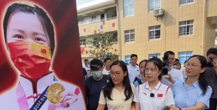 杨倩回乡,拜访母校挤满人,迎接仪式隆重!小学照曝光,和现在几乎一模一样