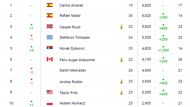 年终排名方面,19岁的阿尔卡拉斯排名第一,纳达尔排名第二,鲁德升至第三,西西帕斯排名第四,德约升至第五,阿利亚西姆排名第六,梅德韦杰夫排名第七,卢布列夫排名第八,弗里茨和胡尔卡奇分别排名第九和第十位。