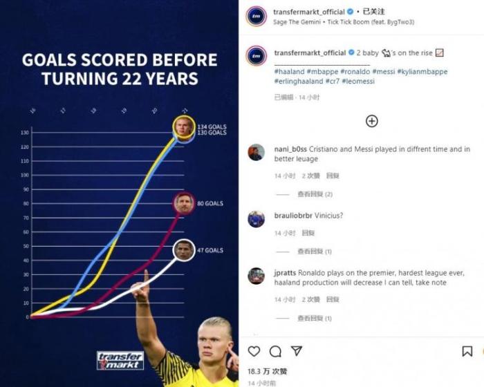 JRS直播网讯05月14日讯 在22岁前,哈兰德打进了134球,姆巴佩打进了130球,远高于同期的梅西(80球),而C罗22岁前只打进了47球。