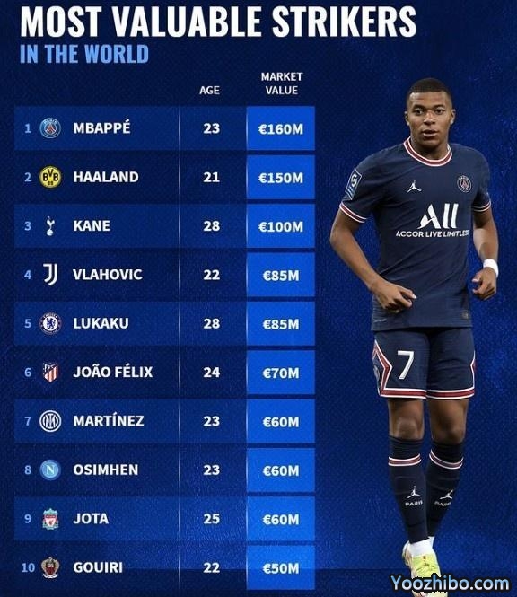 来源:JRS直播网04-11 20:46JRS直播网讯04月11日讯 德国转会市场公布了前锋最新身价榜,巴黎圣日耳曼前锋姆巴佩以1.6亿欧元居首。