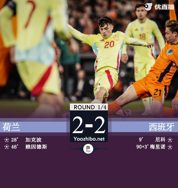 来源:JRS直播网03-21 06:20 JRS直播网讯讯 北京时间3月21日欧洲国家联赛A联赛1/4决赛首回合的较量中,荷兰与西班牙展开激烈对决。比赛开始后,西班牙率先取得领先,尼科-威廉斯接到队友精准传球后成功破门。荷兰迅速调整状态,加克波在一次进攻配合中抓住机会扳平比分。随后,赖因德斯通过团队协作再下一城,帮助荷兰将比分反超。然而,在比赛进入尾声阶段时,哈托因严重犯规被裁判出示红牌罚下,导致场上局势发生变化。补时阶段,西班牙梅里诺挺身而出,用一粒关键进球将比分最终定格为2-2,双方握手言和。