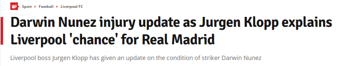 《回声报》表示,努涅斯参加了利物浦在周一的训练课,并且利物浦主帅克洛普也在新闻发布会上表示,努涅斯出战这场比赛的可能性没有被排除。